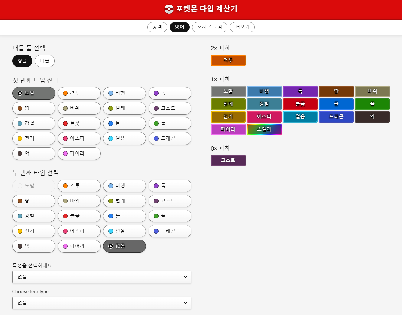 우선 상대방 포켓몬의 타입을 왼쪽에서 선택하면, 오른쪽에 어떤 타입의 기술로 때려야 하는지 세게 때릴 수 있는지 보여줍니다. 최근에 테라스탈로 타입 계산이 복잡해진 것을 감안하여, 아래 테라스탈 타입도 선택하면 그에 맞는 결괏값을 보여주네요.