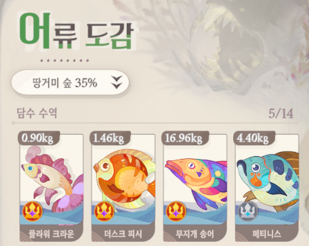 해당 낚시 포인트에서 낚이는 6종의 물고기를 모두 금관 중량으로 낚았을 때, 해당 낚시 포인트에는 초록색 체크 표시가 됩니다.