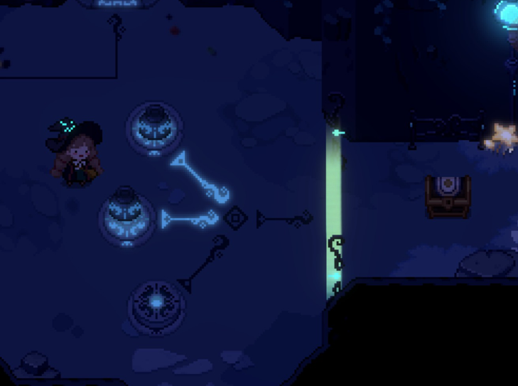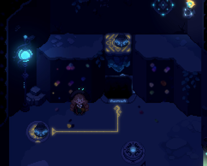 두 항아리를 아래 세 버튼 중 두 군데에 각각 올려두고, 나머지 버튼은 마녀 엘리가 직접 올라가면 퍼즐이 풀립니다. 상자 안에는 별무리 동굴에서 쓸 수 있는 각종 물약들과 루나 코인 주머니들이 있습니다.